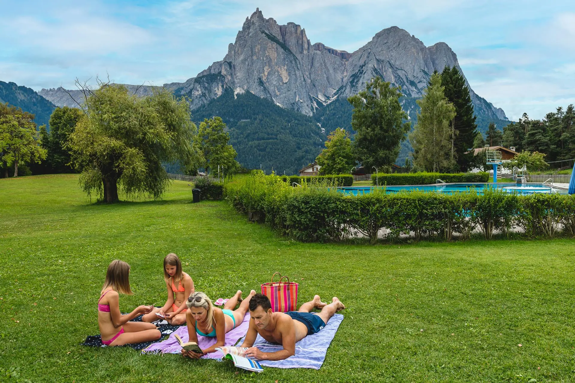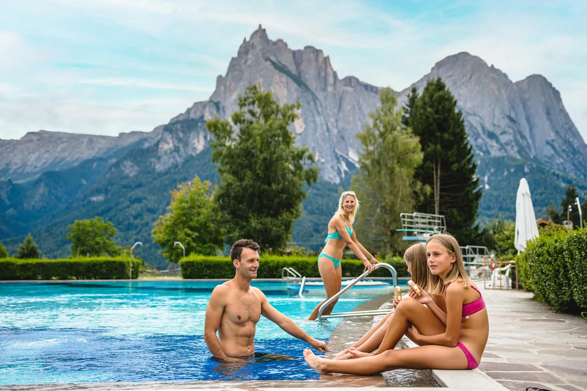 Beim Schwimmen in der Dolomitenregion Seiser Alm kannst du das atemberaubende Dolomitenpanorama genießen und dich an heißen Sommertagen wunderbar abkühlen. Das Schwimmbad von Telfen liegt zwischen Kastelruth und Seis am Schlern und bietet dir einen traumhaften Blick auf die Santnerspitze und den Schlern.